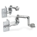 Comunello – conjunto completo de bisagras izquierdas para soldar diseñado para el montaje de portones batientes en terrenos inclinados. El conjunto permite un ajuste preciso de la posición de la hoja gracias al tornillo excéntrico que conecta el soporte de la hoja con la articulación — la rotación de la articulación permite situar la hoja perfectamente a nivel y alinearla con el poste, incluso cuando el terreno está inclinado.