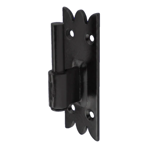 Gancho de construcción para contraventanas decorativo en color negro destinado a la conexión móvil de contraventanas con el marco o bastidor. La chapa de montaje decorativamente acabada con el característico patrón de bordes dentados permite integrar estéticamente el gancho en fachadas tradicionales y rústicas. La sólida construcción de acero galvanizado protegido con laca al óleo garantiza alta resistencia a la corrosión y daños mecánicos — incluso en condiciones atmosféricas exigentes.