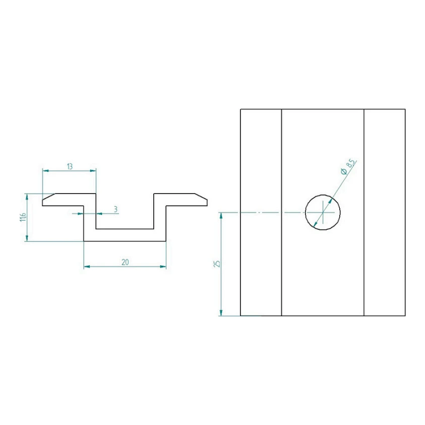 La grapa está fabricada en aluminio 6063/T66 en color plateado natural (acabado en bruto). Esta aleación se caracteriza por su alta resistencia a la corrosión y sus excelentes propiedades mecánicas, lo que garantiza una larga durabilidad de la instalación.
