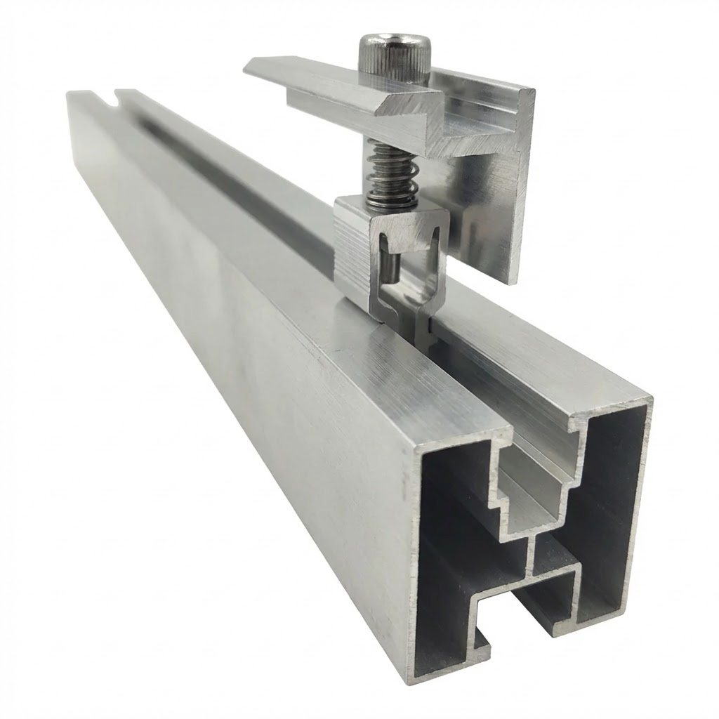 La grapa está fabricada en aluminio 6060 con anodizado plateado, lo que garantiza una alta resistencia a la corrosión y un aspecto clásico y neutro que se adapta a la mayoría de instalaciones FV. El acabado plateado combina perfectamente con los perfiles de montaje de aluminio, creando una estética coherente en todo el sistema.
